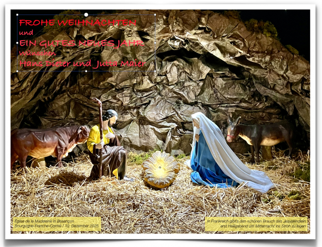 Der besondere Reisereiz liegt in den mannigfaltigen Oszillationen um die direkte Route. Sie können sehr nah und dabei lohnend sein. Diesmal erlaubt der warme Dezember sogar Reisewege, die sonst so nicht möglich oder sinnvoll sind. Schwerpunkt ist diesmal der französische Teil der Route. Weiteres Kriterium ist die Vorweihnachtszeit, die Adventszeit.