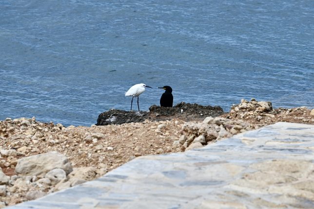 Als Zugvögel sind Seidenreiher (wiss. Egretta garzetta) auch zwischen Deutschland und Afrika unterwegs. Als Schreitvögel gehören sie zur Familie der Reiher. Wie die Kormorane sind Seidenreiher recht schweigsam – vielleicht deshalb die gegenseitige Zuneigung. Auch für die Gefiederpflege nehmen sich beide viel Zeit. Die viel tauchenden Kormorane trocknen sich mit ausgebreiteten Flügeln wie Sonnenanbeter.