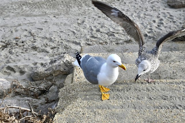 Die beiden Silbermöwen profitieren von unserem vorweihnachtlichen Pique-nique in Saintes-Maries-de-la-Mer am menschenleeren breiten Sandstrand. Es gibt ein wunderbares halbes Poulet Fermier vom Straßengrill mit Baguette aus der Boulangerie nebenan. (Könnte mit jeder Weihnachtsgans konkurrieren, kommt mir in den Sinn)