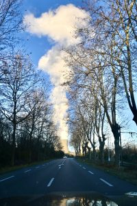 Wieder en route: Der Wasserdampf über den Atommeiler hinter der Allee fasziniert, wenn auch etwas unweihnachtlich