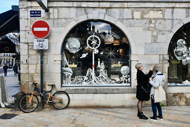 Während weihnachtliche Dekorationen hier eher bescheiden zurückhaltend sind, begeistern uns aufwändige eigenständige Gestaltungen der Geschäfte, hier eines Uhrmachers.