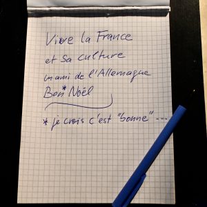 Auf einem neben der Krippe liegenden Notizblock hinterlassen wir spontan eine Botschaft. Dazu noch eine Gender-Info: Noël ist weder weiblich noch männlich! HDMs schlechtes Gewissen wäre nicht nötig gewesen