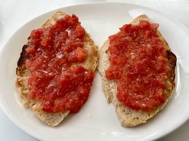Vermutete Zubereitung nach der Busfahrt „Vom mediterranen Tostada con tomate mit kalt gepresstem Olivenöl (aceite de oliva), Meersalz und Wasser kann man leben“, sagte Siegfried Borho, ein unvergessener deutsch-spanischer Unternehmer Auch für uns ist das Tostada täglich Brot geworden