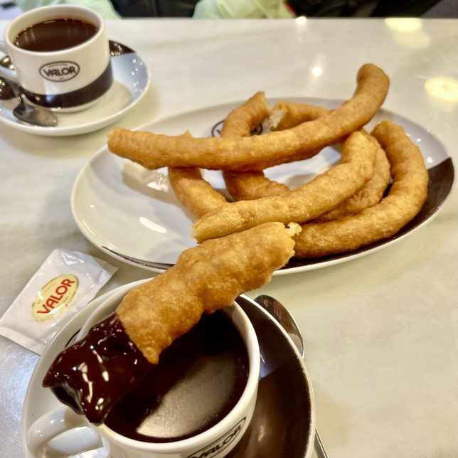 Spanisches Weihnachtsgebäck ist in diesen Tagen noch rar. Stattdessen genießen wir eine typische heiße Schokolade mit köstlichen Churros (eine Art leichter essbare längliche Krapfen)