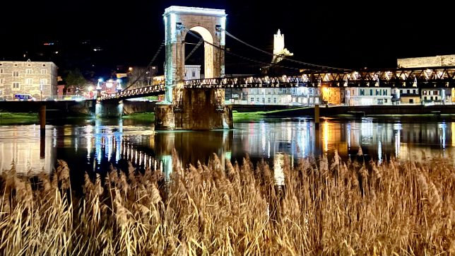 Weihnachtlich leuchtet die Rhône-Brücke hinüber nach Tournon-sur-Rhône
