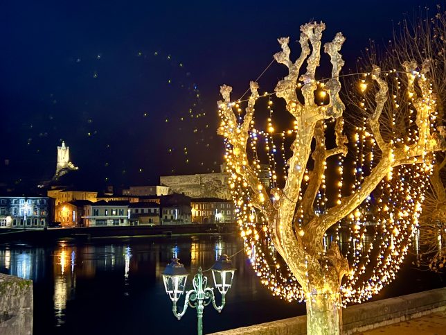 Höchst festlich gibt sich unser nächster Übernachtungsort Tain L´Hermitage in der Provinz Ardéche. Hier werden die winterlich blattlosen Platanen entlang der Rhône zu nadellosen Christbäumen geadelt